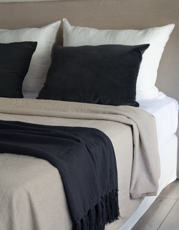 Almohadón con frente de terciopelo de algodón negro y reverso de tusor al tono,  con cierre inferior oculto.